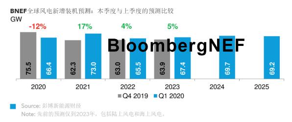 12%-疫情沖擊風(fēng)電行業(yè)后,BNEF風(fēng)電新增吊裝容量預(yù)測較上一季度的下調(diào)幅度