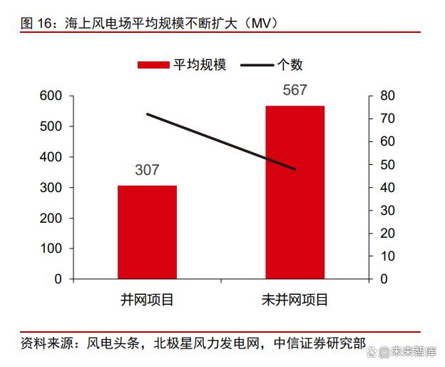 大型化和風(fēng)電場規(guī)?;铀?,推動風(fēng)機降本。大型化是海風(fēng)降低單位 GW 成本的主要 途徑,大型風(fēng)機單位功率對應(yīng)的耗材更少,同時由于大型化后所需機組數(shù)量有效減少,可 顯著降低安裝及運維成本。根據(jù)明陽智能官網(wǎng)披露,以明陽智能 MySE12MW 半直驅(qū)海上 機組為例,在 1000MW 項目中,8MW 機組需要 125 臺,12MW 機組僅需 84 臺,節(jié)約用 海面積 30%以上,全場基礎(chǔ)成本降低 24%,塔筒成本降低 27%,經(jīng)濟性凸顯。