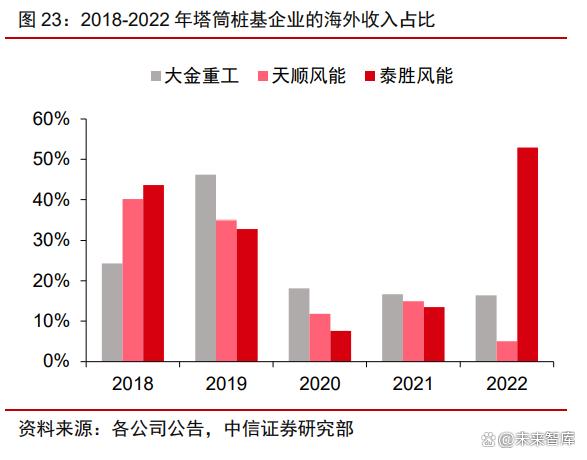 頭部廠商重視外銷業(yè)務(wù),有望持續(xù)拓展全球市場份額。國內(nèi)頭部企業(yè)均積極延伸海外 業(yè)務(wù),在建產(chǎn)能規(guī)劃于2023-2024 年陸續(xù)投產(chǎn)。代表性廠商在 2018-2019 年海外收入占 比平均超 30%,2020 年和 2021 年受益陸上和海上風(fēng)電搶裝潮,產(chǎn)品內(nèi)銷需求量和毛利 率有所上漲,廠商業(yè)務(wù)重點(diǎn)著眼于國內(nèi)市場,外銷業(yè)務(wù)占比下降至 15%左右。隨著疫情形 勢(shì)平穩(wěn)和國內(nèi)搶裝潮結(jié)束,2022 年頭部廠商繼續(xù)海外布局,以泰勝風(fēng)能為代表的塔筒樁 基企業(yè)海外收入占比創(chuàng)歷史新高。我們預(yù)計(jì)隨著海工頭部廠商出海節(jié)奏的加快,頭部企業(yè) 將在經(jīng)濟(jì)性、飽滿產(chǎn)能、穩(wěn)定交付能力、海外歷史業(yè)績的優(yōu)勢(shì)基礎(chǔ)上繼續(xù)拓展海外海上塔 筒和樁基市場,搶占全球市場份額。