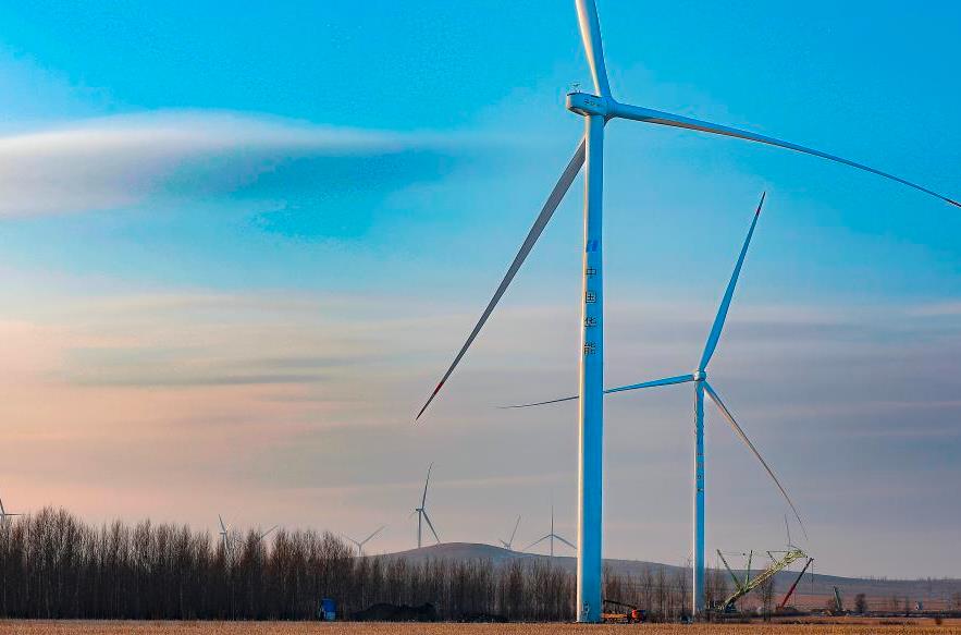2022年12月27日,施工人員在華能突泉30萬千瓦風電項目建設現(xiàn)場吊裝最后一臺風電組件。