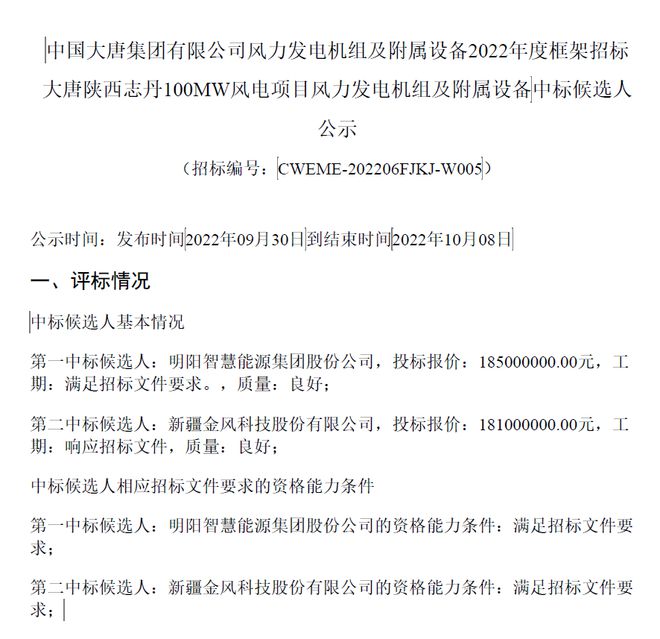 9月30日,中國(guó)大唐集團(tuán)有限公司風(fēng)力發(fā)電機(jī)組及附屬設(shè)備2022年度框架招標(biāo)大唐陜西志丹100MW風(fēng)電項(xiàng)目風(fēng)力發(fā)電機(jī)組及附屬設(shè)備中標(biāo)候選人公示,明陽(yáng)智能預(yù)中標(biāo),投標(biāo)報(bào)價(jià)18500萬(wàn)元。