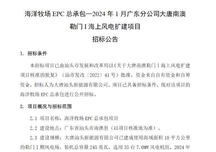 招標范圍:本次招標為大唐南澳勒門 I 海上風電擴建項目海洋牧場 EPC總承包工程,包括但不限于勘察設(shè)計、采購、運輸、施工、調(diào)試、驗收、質(zhì)量保證服務(含 CCS 檢測認證、三同時)等全部工作及招標技術(shù)文件規(guī)定的其它工作,具體工作范圍詳見技術(shù)規(guī)范書。