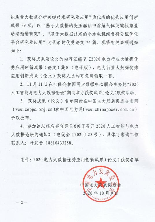 2.11月11日在電促會和國網(wǎng)大數(shù)據(jù)中心聯(lián)合主辦的“2020人工智能與電力大數(shù)據(jù)論壇”期間舉辦獲獎成果(論文)頒獎活動。