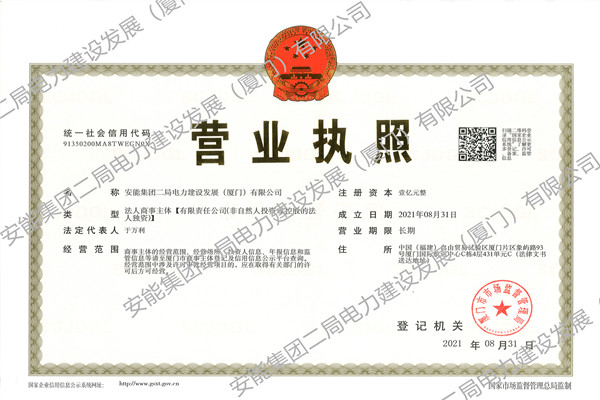 中國(guó)電力網(wǎng)訊 8月31日,中國(guó)安能第二工程局電力建設(shè)發(fā)展(廈門(mén))有限公司順利完成工商登記并取得營(yíng)業(yè)執(zhí)照。