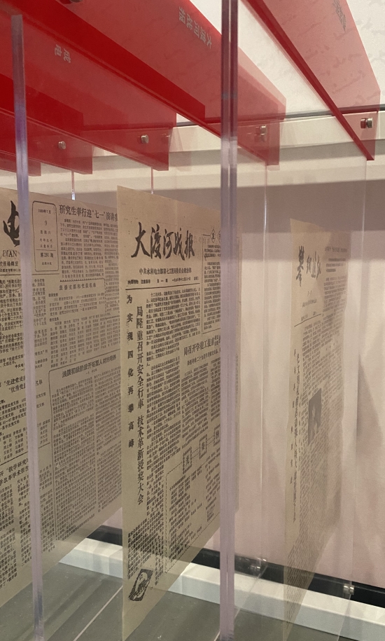現(xiàn)場展出的大渡河水電報創(chuàng)刊號為《大渡河戰(zhàn)報》,出刊于1978年12月,誕生于十一屆三中全會召開時期,4開4版,與解放思想,改革開放同行。發(fā)刊詞上,明確辦報方針:實事求是,群眾路線,力求做到尖銳、潑辣、鮮明。一路走來,初心不改,為歷史發(fā)聲,為時代立傳,報道水電七局重大歷史事件、重大工程節(jié)點(diǎn)、職工工作生活感悟等。
