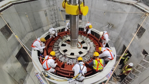 春節(jié)前夕,斯里蘭卡莫拉戈拉水電站2號機轉子順利吊裝就位。吊裝過程中,現場指揮指令清晰,人員操作準確,定子上方人員防護到位,定轉子間隙、水發(fā)聯軸方位、制動環(huán)板間隙等監(jiān)測人員細心負責,吊裝步驟按照方案及交底有序進行,展示出電建人高度的責任感和精湛的技術水平。(陳敏元)