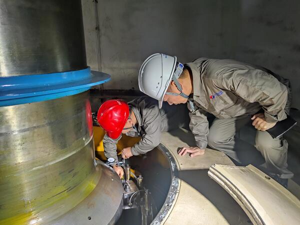 在檢修車間內(nèi),陳曉輝蜷縮在調(diào)速器主配壓控制柜旁,左手舉著強光手電,右手用內(nèi)六角扳手逐個緊固連接螺栓。老撾籍維護員本馬舉著故障記錄本,用中文大聲報告壓力波動數(shù)值:“陳站長,油壓從5.9兆帕降到5.6了!”