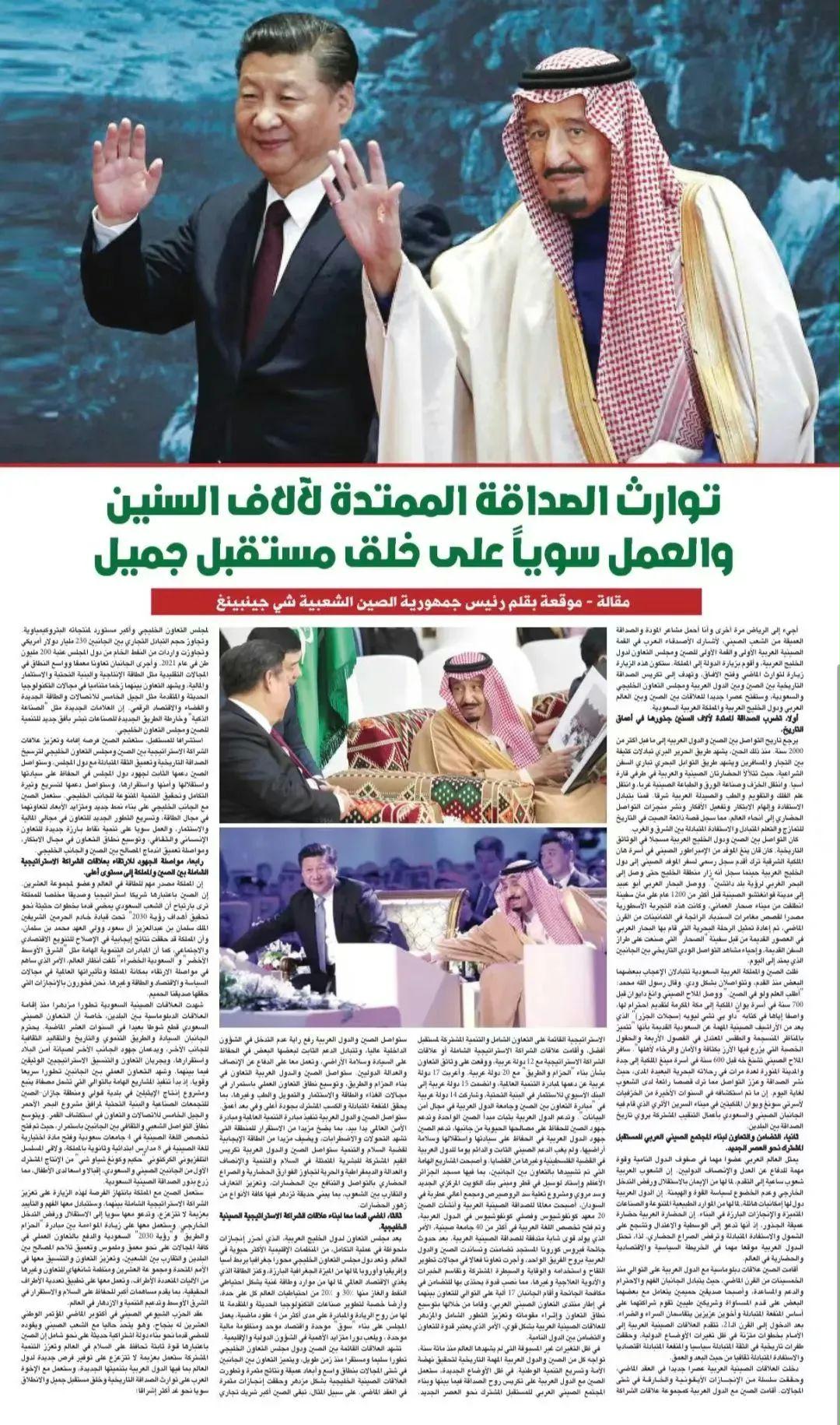 12月8日,在抵達利雅得出席首屆中國-阿拉伯國家峰會、中國-海灣阿拉伯國家合作委員會峰會并對沙特進行國事訪問之際,國家主席習近平在沙特《利雅得報》發(fā)表題為《傳承千年友好,共創(chuàng)美好未來》的署名文章。