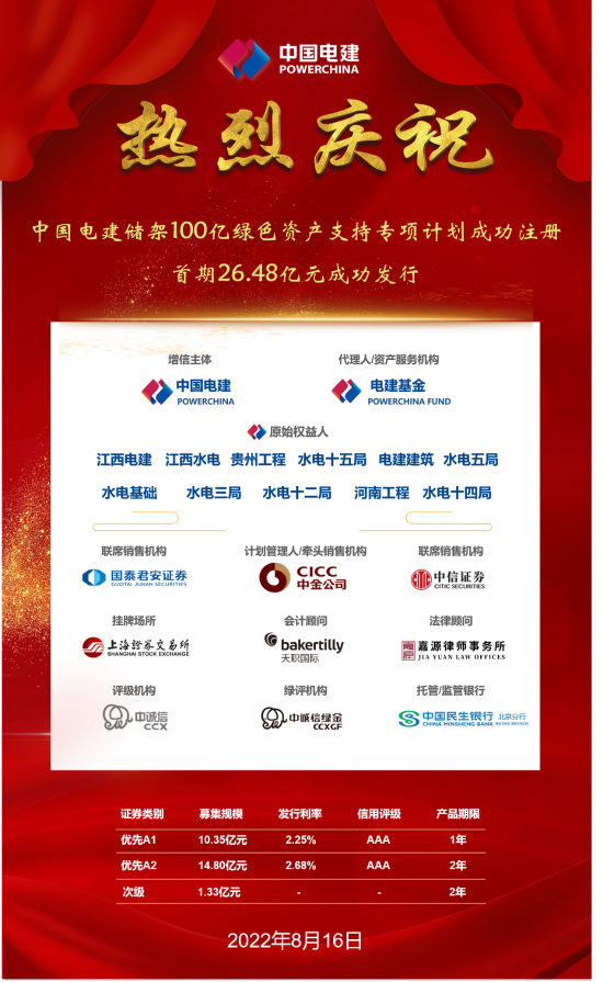 近日,“中國電建2022年第1-10期綠色資產(chǎn)支持專項計劃”取得上海證券交易所批復(fù),綠色儲架規(guī)模達(dá)100億元。本項目以電建股份成員單位持有的綠色應(yīng)收款項為基礎(chǔ)資產(chǎn),由電建股份作為增信機(jī)構(gòu),電建基金作為代理人統(tǒng)一歸集基礎(chǔ)資產(chǎn)并發(fā)行綠色資產(chǎn)支持證券。一次儲架分次發(fā)行和基金公司代理人模式為電建成員單位提供了壓降“兩金”、降低資產(chǎn)負(fù)債率的便捷高效新渠道。
