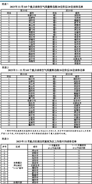 11月,168個重點城市中:空氣質量排名前20位城市依次是張家口、拉薩和福州等城市(從第1名至第20名);空氣質量排名后20位城市依次是安陽、蘭州和鶴壁等城市(從倒數第1名至并列倒數第18名)。見附表1。