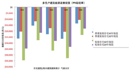通過(guò)計(jì)算多住戶建筑平均用能支出和低效住宅建筑用能支出,落基山研究所以4%貼現(xiàn)率對(duì)比了多住戶建筑用能支出的現(xiàn)值。我們發(fā)現(xiàn),凈零排放改造最具經(jīng)濟(jì)吸引力的區(qū)域是第1氣候區(qū)域,第4區(qū)緊隨其后。