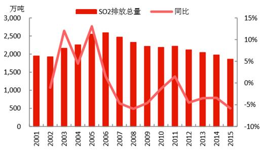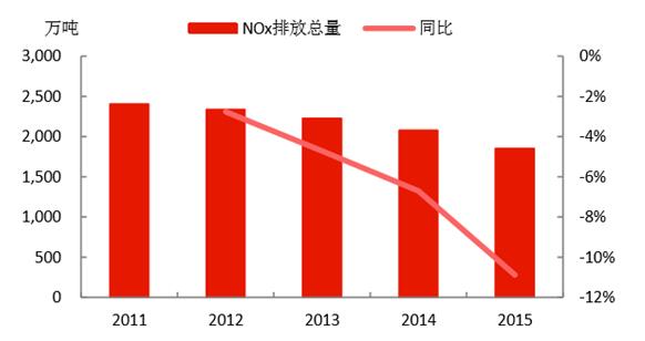 經(jīng)過“十二五”的治理,四項(xiàng)污染物減排約束性指標(biāo)均實(shí)現(xiàn)了持續(xù)下降,完成了“十二五”的減排任務(wù),取得了一定的環(huán)保成果。2015年:1)COD的排放量為2224萬噸,且每年以3%左右的速度下降;2)氨氮的排放量為230萬噸,且每年以3%左右的速度下降;3)SO2的排放量為1859萬噸,每年基本以4%左右的速度下降,而收關(guān)年2015年下降速度高達(dá)5.84%;4)NOx的排放量為1852萬噸,“十二五”剛開始治理,當(dāng)前的下降速度還處于上升趨勢,收關(guān)年2015年下降速度高達(dá)10.89%。