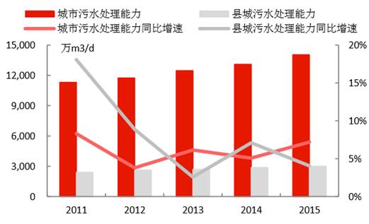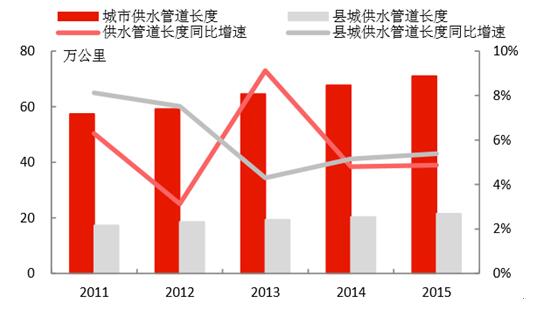 城鎮(zhèn)化的推進(jìn),為水務(wù)行業(yè)持續(xù)帶來增量空間。1)我國城鎮(zhèn)人口2015年達(dá)到7.71億,近年城鎮(zhèn)人口增速維持在3%左右;城市建成區(qū)面積2015年達(dá)到5.21萬平方公里,近年面積增速維持在4-5%。2)城市供水總量在2015年達(dá)到561億立方米,同比增速為2.5%;縣城的供水量達(dá)106.9億立方米,增速有所下降,僅為0.56%。3)城市供水管網(wǎng)長度在2015年達(dá)到71.0萬公里,同比增速為4.87%;縣城的供水管網(wǎng)長度為21.5萬公里,同比增速達(dá)5.39%;通過管網(wǎng)建設(shè),是的用水普及率持續(xù)提升,城市和縣城2015年的用水普及率分別為98.1%和90.0%。4)城市污水處理能力在2015年達(dá)到1.40億立方米/日,同比增長7.19%;縣城達(dá)到2999萬立方米/日,同比增長了4.06%,城市和縣城的污水處理率分別達(dá)到91.9%和85.2%,較2010年分別提升了9.6和25.1個(gè)百分點(diǎn)。