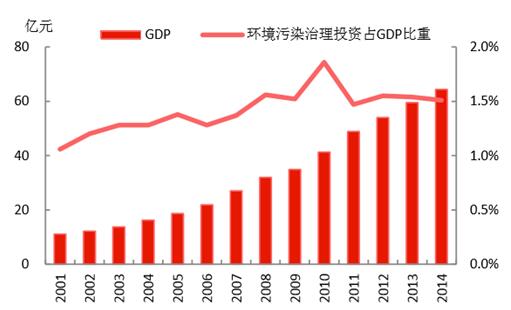 從國家統(tǒng)計(jì)局的數(shù)據(jù)可以看到,我國在環(huán)境污染治理方面的投資量,呈現(xiàn)上升趨勢,2014年達(dá)到9576億元;近年占GPD的比重維持在1.5%左右,較2001年提升約0.5個(gè)百分點(diǎn)。發(fā)改委、環(huán)保部印發(fā)《關(guān)于培育環(huán)境治理和生態(tài)保護(hù)市場主體的意見》,提出目標(biāo),“十三五”綠色環(huán)保產(chǎn)業(yè)產(chǎn)值年均增長15%以上,遠(yuǎn)高于CDP的增長目標(biāo),為經(jīng)濟(jì)增長注入動(dòng)力。