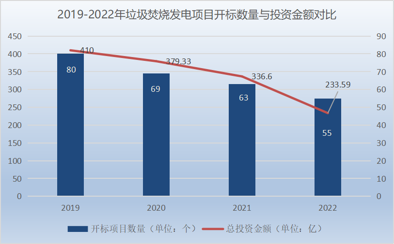垃圾焚燒發(fā)電行業(yè)在歷經“跑馬圈地”、“搶裝潮”等時期后,進入冷靜發(fā)展期。北極星固廢網統(tǒng)計了2019年-2022年的垃圾焚燒發(fā)電項目開標數量以及投資總額,整體呈逐年下滑趨勢。