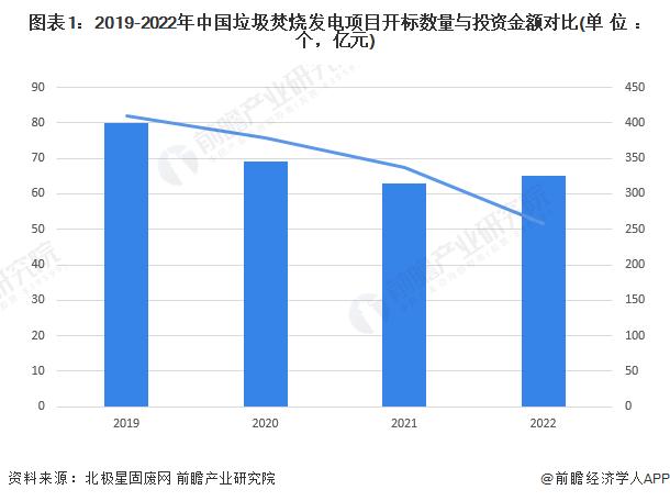 垃圾焚燒發(fā)電行業(yè)在歷經(jīng)“跑馬圈地”、“搶裝潮”等時期后,進入冷靜發(fā)展期。北極星固廢網(wǎng)統(tǒng)計了2019年-2022年的垃圾焚燒發(fā)電項目開標(biāo)數(shù)量以及投資總額,整體呈逐年下滑趨勢。2022年中國垃圾焚燒發(fā)電項目開標(biāo)數(shù)量下降為65項,總投資金額為258億元。