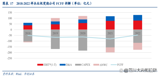 垃圾焚燒行業(yè) FCFF(自由現(xiàn)金流) 拆解。我們選取瀚藍(lán)環(huán)境、旺能環(huán)境、上海環(huán)境、中科環(huán)保、軍信股份、綠色動力、城發(fā)環(huán)境和三峰環(huán)境 8 家質(zhì)地較純(垃圾焚燒占營收比重高,暫無明顯第二成長曲線邏輯)的公司作為樣本進(jìn)行分析:CAPEX 較重,F(xiàn)CFF 尚未轉(zhuǎn)正。垃圾焚燒行業(yè)的固定資產(chǎn)投資較重,據(jù)圖概算,垃 圾焚燒設(shè)施的單噸投資成本可達(dá) 50 萬元以上,CAPEX 對于 FCFF 的拖累極大,2020 年8 家上市公司的資本開支高達(dá)-182 億元,而同期的 EBIT*(1-T)僅為 59 億元。但此后隨著行業(yè)新中標(biāo)項目數(shù)量的減少,板塊的 CAPEX 也呈現(xiàn)下降趨勢,F(xiàn)CFF 明顯回升To G 生意占比較高,應(yīng)收賬款拖累營運資本。垃圾焚燒公司的收入主要可以分為垃圾處理費與上網(wǎng)電費,其中垃圾處理費與政府結(jié)算向居民端的順價并不順利,上網(wǎng)電費中標(biāo)桿電價與國家電網(wǎng)結(jié)算較為及時,國補和省補均存在一定的拖欠。尤其 2020 年后垃圾焚燒電費國補的發(fā)放進(jìn)度變緩后,ΔNWC 對于 FCFF 的貢獻(xiàn)也由正轉(zhuǎn)負(fù)。