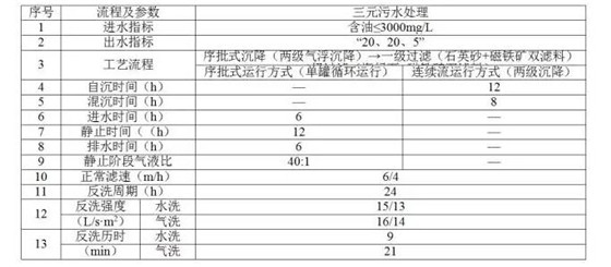 一次沉降罐、二次沉降罐、升壓緩沖罐、一次過(guò)濾罐、二次過(guò)濾罐、凈化水罐。主工藝流程介紹:該工藝中沉降段共有沉降罐4座,既可以實(shí)現(xiàn)兩級(jí)連續(xù)流沉降處理,又可以實(shí)現(xiàn)一級(jí)序批式沉降處理,每座沉降罐都配有曝氣系統(tǒng)。在原水含劑濃度低時(shí),運(yùn)行兩級(jí)連續(xù)流沉降;當(dāng)原水含劑濃度升高,兩級(jí)連續(xù)流沉降處理不能保證出水合格時(shí),運(yùn)行一級(jí)序批式沉降。