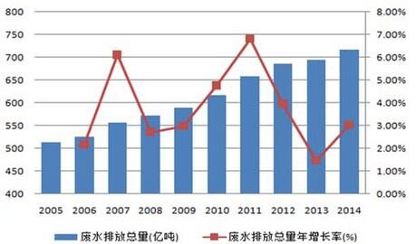 據(jù)統(tǒng)計(jì),目前全國(guó)地表水體中Ⅰ類、Ⅱ類、Ⅲ類、Ⅳ類、Ⅴ類和劣Ⅴ類水質(zhì)占比分別為31%、30%、21%、6%、9%和3%,其中Ⅳ類及Ⅳ類以下水質(zhì)水體占比近4成,水質(zhì)污染問題嚴(yán)重。每年水質(zhì)污染給人體健康、工業(yè)生產(chǎn)、農(nóng)業(yè)生產(chǎn)和漁業(yè)養(yǎng)殖等方面造成的經(jīng)濟(jì)損失約2400億。。2014年全國(guó)廢水排放總量約為716億噸,較2005年的514億噸增長(zhǎng)近4成,2005至2014十年間年復(fù)合增長(zhǎng)率為3.4%,保持逐年穩(wěn)步增長(zhǎng)。