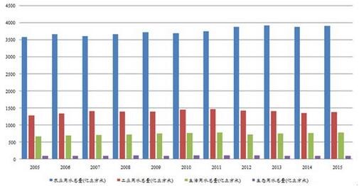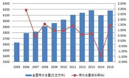 過去10年間,隨著人口增長(zhǎng),城市建設(shè)以及經(jīng)濟(jì)增長(zhǎng),全國(guó)用水總量總體呈現(xiàn)持續(xù)增長(zhǎng)態(tài)勢(shì),在2015年達(dá)到6180億立方米。(其中,由于首次進(jìn)行最嚴(yán)格水資源管理制度考核、以及農(nóng)業(yè)水價(jià)綜合改革和工業(yè)用水差別水價(jià)政策的推進(jìn),2014年的農(nóng)業(yè)和工業(yè)用水量分別出現(xiàn)下降,全國(guó)用水總量同時(shí)環(huán)比下降1.4%。)05至15年的用水總量年均復(fù)合增長(zhǎng)率約為0.93%,據(jù)此計(jì)算到2030年全國(guó)用水總量將達(dá)到7100億立方米。這一預(yù)測(cè)與《全國(guó)水資源綜合規(guī)劃》劃定的2030年用水上限不超過7000億立方米基本一致。因此,在可預(yù)見的未來,用水量仍將繼續(xù)增長(zhǎng)。