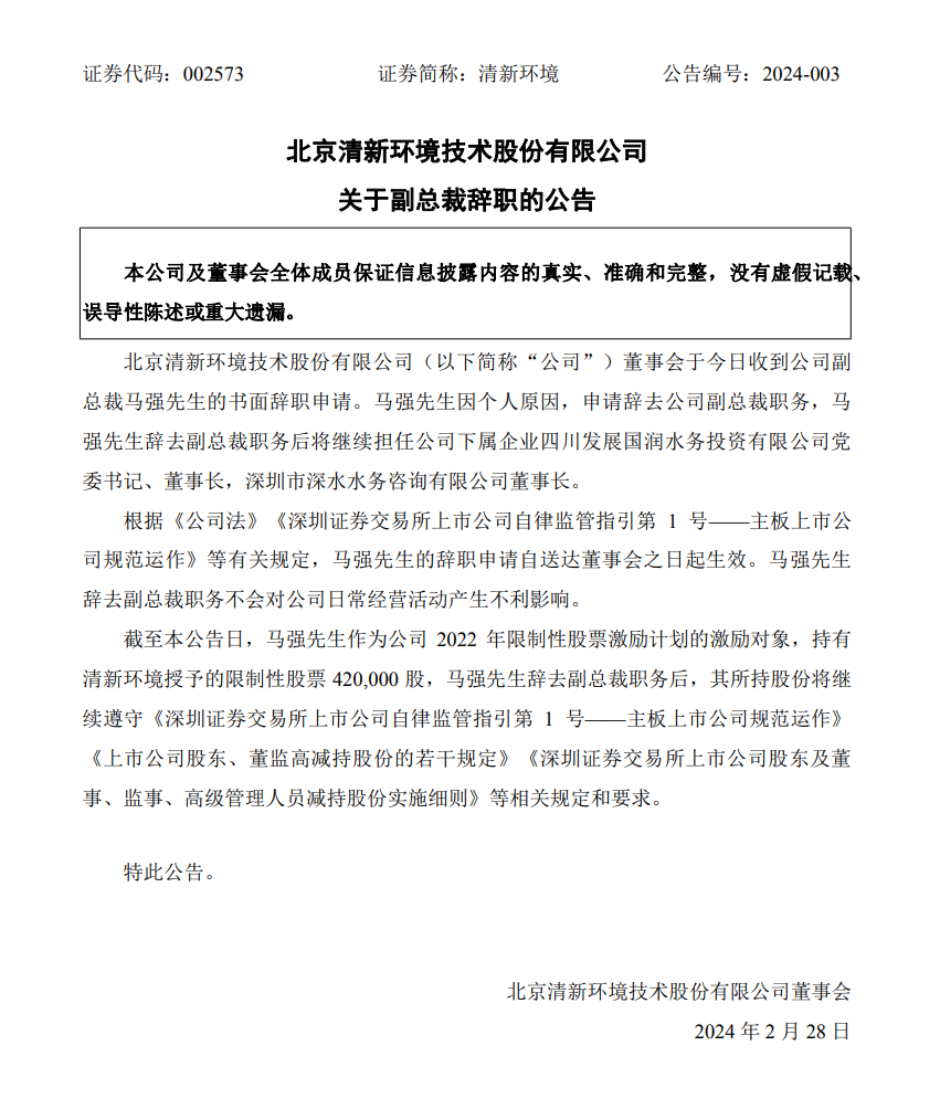 2月28日,清新環(huán)境發(fā)布公告稱,公司董事會于當(dāng)日收到公司副總裁馬強先生的書面辭職申請。馬強先生因個人原因,申請辭去公司副總裁職務(wù),馬強先生辭去副總裁職務(wù)后將繼續(xù)擔(dān)任公司下屬企業(yè)四川發(fā)展國潤水務(wù)投資有限公司黨委書記、董事長,深圳市深水水務(wù)咨詢有限公司董事長。