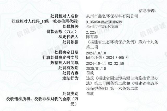 臺(tái)海網(wǎng)10月12日訊 根據(jù)泉州市生態(tài)環(huán)境局近日發(fā)布的行政處罰信息公開表(閩泉環(huán)罰(2024)465號)顯示,因當(dāng)事人違反《福建省固定污染源自動(dòng)監(jiān)控管理辦法》第二十四條第二款和《福建省生態(tài)環(huán)境保護(hù)條例》第十六條第二款,對泉州市鑫弘環(huán)保材料有限公司處以人民幣22250元罰款。