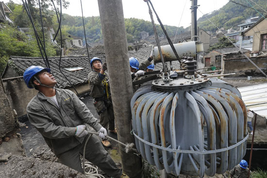 中國電力網(wǎng)訊 11月4日一大早,在浙江寧波鄞州區(qū)塘溪鎮(zhèn)東山村,三輛電力工程車正載著二十余名工作人員沿著山路蜿蜒而上,當(dāng)天,他們的工作任務(wù)是拆除大嵩片區(qū)內(nèi)最后一臺屋頂變壓器。
