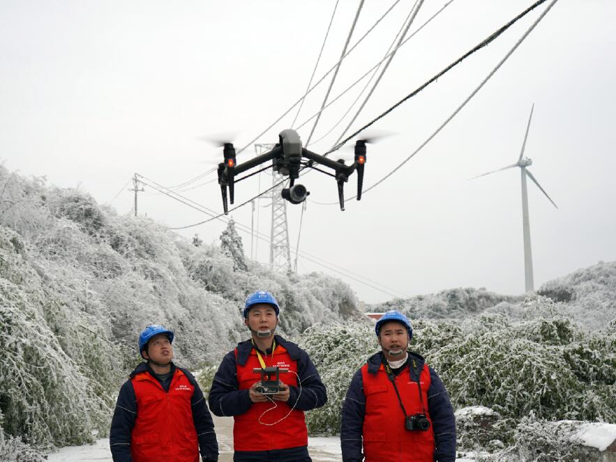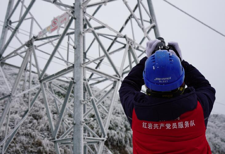 中國電力網(wǎng)訊 “110千伏四黎線今日最大覆冰厚度7.9毫米,目前風(fēng)速3.5米每秒,溫度零下4度……”“小心一點,要走兩邊有草叢的地方,中間的道路結(jié)冰了,容易滑倒。”1月9日,國網(wǎng)重慶武隆供電公司輸電運維檢修班成員吳鼎、趙樓等人來到武隆區(qū)和順鎮(zhèn)四眼坪鄉(xiāng)對覆冰線路開展特殊巡視。在白雪皚皚的四眼坪,國家電網(wǎng)紅巖共產(chǎn)黨員服務(wù)隊隊服的顏色成了冰雪世界里最靚麗的一抹紅,他們手拿著無人機、砍刀、繩索、望遠(yuǎn)鏡、風(fēng)速儀等設(shè)備再一次踏入他們熟悉的“冰雪戰(zhàn)場”。