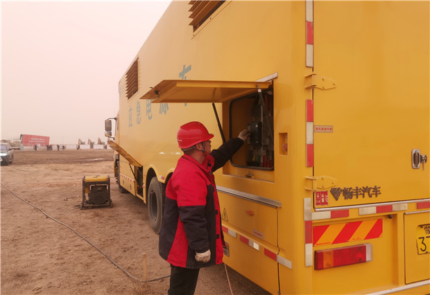 開工儀式當(dāng)天沙塵天氣持續(xù),揚(yáng)沙隨風(fēng)彌漫,突擊隊(duì)的保電人員不辭辛苦一大早便提前進(jìn)入會(huì)場。將發(fā)電車??吭谇捌诓榭钡闹付ㄎ恢茫龊冒踩O(jiān)護(hù)相關(guān)的工作之后,啟動(dòng)車輛試運(yùn)行,檢查了各項(xiàng)儀表數(shù)據(jù),并做好與用戶側(cè)供電設(shè)備的對(duì)接,全力以赴投入保電工作。該分局領(lǐng)導(dǎo)帶領(lǐng)保電人員全程守候在現(xiàn)場,隨時(shí)應(yīng)對(duì)突發(fā)停電事故的發(fā)生,確保了開工儀式用電萬無一失。