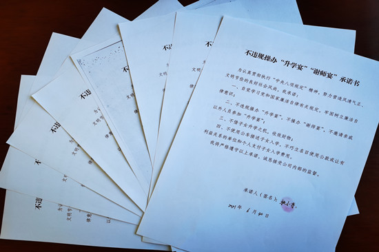 除短信提醒墻外,該公司黨總支重申紀律要求,組織對公司全體干部員工對家中有升學(xué)子女的職工向公司黨總支備案,督促簽訂《不違規(guī)操辦“升學(xué)宴”“謝師宴”承諾書》8份,并開展集體約談,予以重點監(jiān)督。