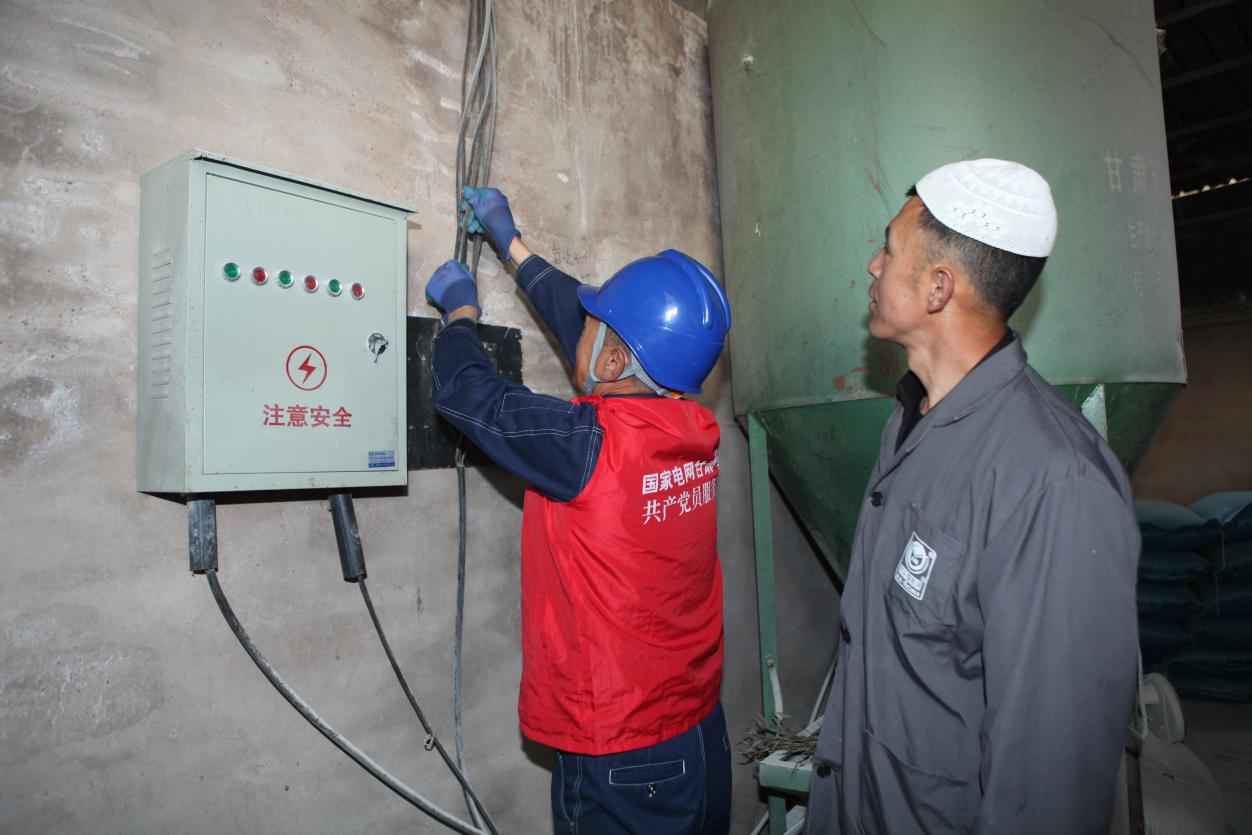 國家電網(wǎng)甘肅電力連心橋(臨夏馬進(jìn)偉)共產(chǎn)黨員服務(wù)隊(duì)隊(duì)員檢查養(yǎng)殖農(nóng)民專業(yè)合作社安全用電情況。