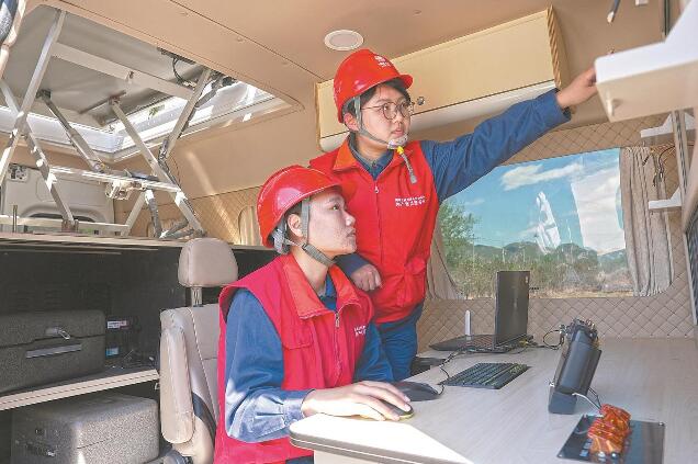 無人機智能巡檢黨員突擊隊隊員在無人機巡檢“航母”作業(yè)車內(nèi)查看山區(qū)輸配電線路情況