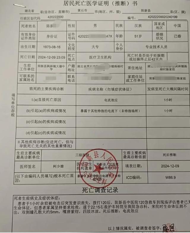 陳勇的中學(xué)同事們把他背到救護(hù)車能到達(dá)的地方,醫(yī)生說已經(jīng)沒有搶救的必要了。在家屬堅(jiān)持下,他被送到醫(yī)院,經(jīng)過搶救后還是被宣布身亡。死亡推斷書顯示,直接死亡原因?yàn)?ldquo;電流效應(yīng)”。