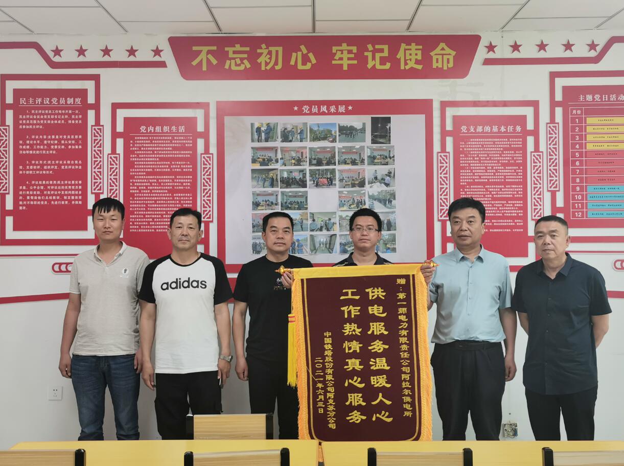 中國(guó)鐵塔阿克蘇分公司負(fù)責(zé)人蔣羽將一面寫著“供電服務(wù)溫暖人心·工作熱情真心服務(wù)”的錦旗送到一師電力阿拉爾供電所負(fù)責(zé)人手中,對(duì)他們優(yōu)質(zhì)、高效的供電服務(wù)贊不絕口。