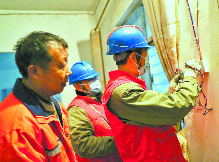 胡金剛(右一)為返鄉(xiāng)村民楊國紅檢修家中線路。