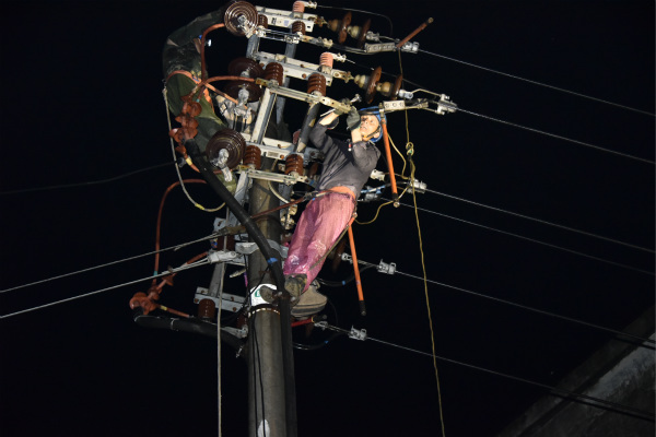 該線路斷線區(qū)域處于陡坡地勢復(fù)雜,且雨天較滑,搶修放線工作難度較大。在各部門的討論部署下,23名搶修人員做好搶修準(zhǔn)備工作趕往現(xiàn)場。盡管多方面原因?qū)е聯(lián)屝揠y度大、任務(wù)重,但搶修人員毫無怨言,大家只想讓停電用戶能夠盡早用上電。雨勢稍有減停,晚上8時在調(diào)度部門的許可下斷開10千伏亨泰線開關(guān),搶修人員做好相關(guān)安全防護(hù)措施,搶修工作有序進(jìn)行......