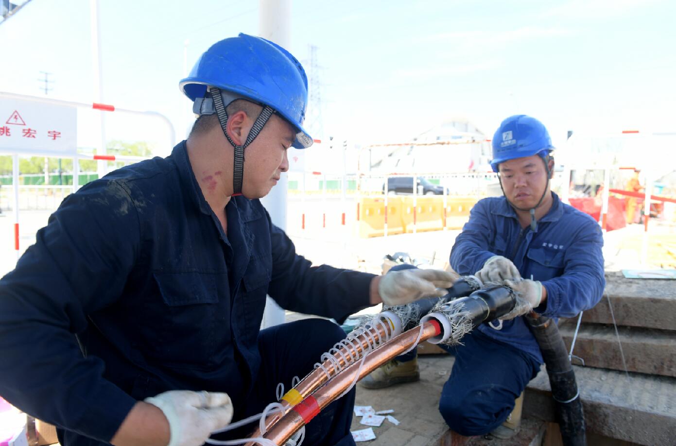 隨著太陽慢慢升高,空氣也逐漸“火熱”起來,上午11時(shí),電纜通道做好后,帶電作業(yè)班員工頂著驕陽在絕緣斗內(nèi)緩緩升到了15米高空。“有一面電纜是迎著太陽的,做接頭的時(shí)候眼睛都睜不開,斗內(nèi)氣溫太高了,一會(huì)就全身都是汗。”帶電作業(yè)班員工鄒偉偉說道。身披厚厚的絕緣服,手上帶著里外三層手套,一場作業(yè)下來就像是從水里撈上來一樣。