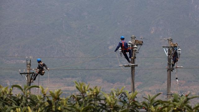 10千伏興頂線施工現場,兩名工作人員電桿作業(yè)。盧關文攝