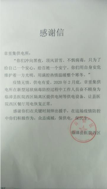 章里集供電所所長吳超接過重量雖輕卻又意義非凡的感謝信后激動地說:“謝謝你們對我們工作的肯定,疫情戰(zhàn)場上,是你們白衣天使沖鋒在前。作為國家電網(wǎng)人,我們更要發(fā)揚頂?shù)蒙稀⒖康米?、打得贏得電力鐵軍精神,攜手打贏這場沒有硝煙的戰(zhàn)疫!”