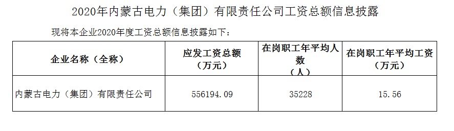 2020年內(nèi)蒙古電力(集團(tuán))有限責(zé)任公司工資總額信息披露