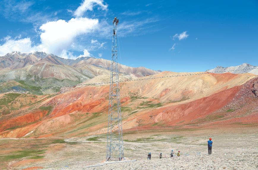 國(guó)網(wǎng)青海海西供電公司員工在蘇里鄉(xiāng)組立蘇里35千伏輸變電工程106號(hào)鐵塔