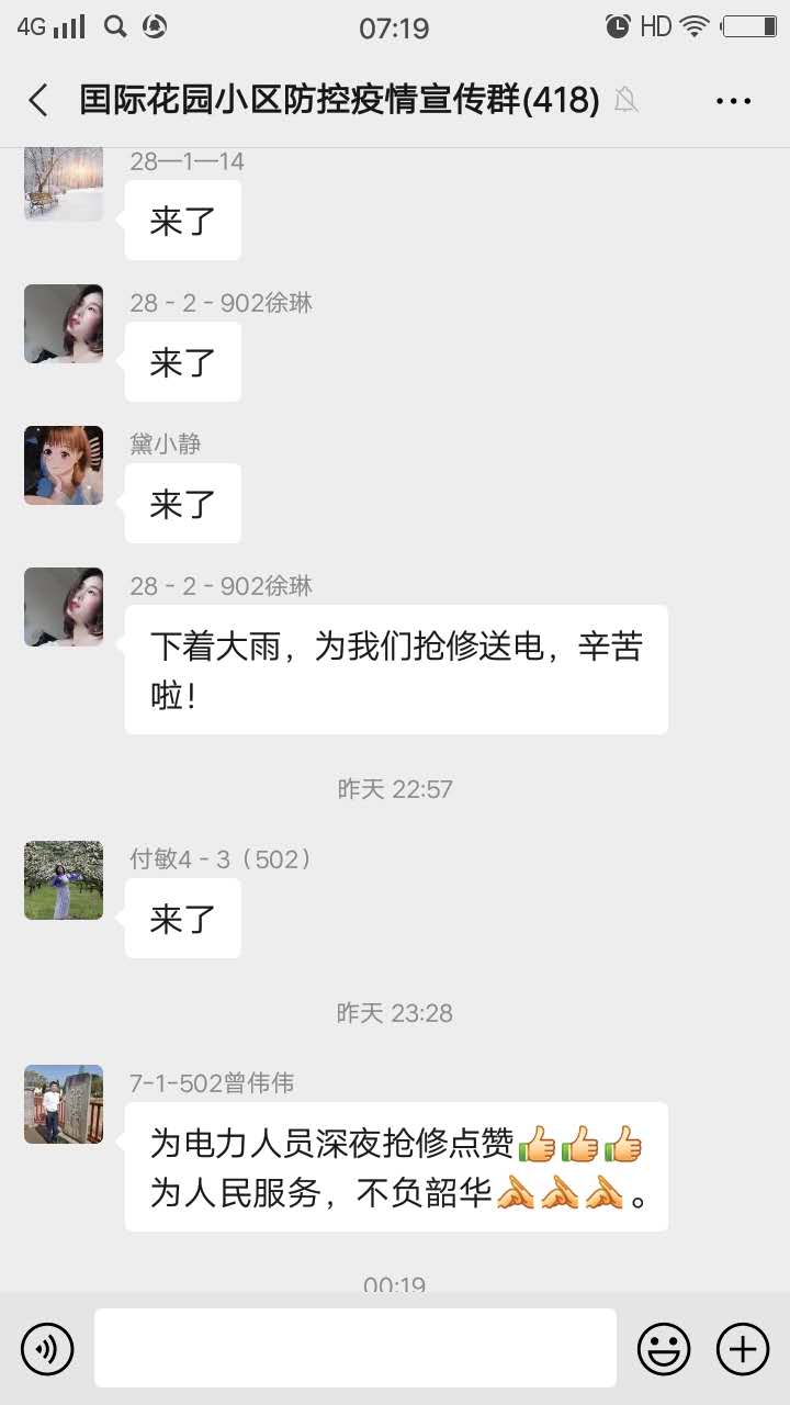 中國電力網(wǎng)訊 客戶又一次在微信群里表揚(yáng)國網(wǎng)南豐縣供電公司搶修人員“為人民服務(wù),不負(fù)韶華,”并為他們點贊。