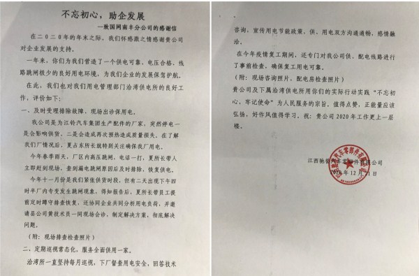 中國電力網(wǎng)訊 12月21日,國網(wǎng)南豐縣供電公司收到江西馳譽汽車零部件有限公司送來的感謝信,對該公司提供的良好用電環(huán)境表示衷心感謝。
