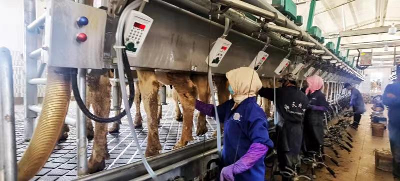 擠奶車間里,黑白相間的奶牛列隊走上緩緩轉(zhuǎn)動的擠奶轉(zhuǎn)臺,工人們依次對它們進行采奶前的乳頭清洗消毒工作,隨后,德國原裝進口轉(zhuǎn)盤擠奶機對奶牛進行自動擠奶。看著一股股潔白的乳汁流進容器,場長郭宏勝露出喜悅的笑容。