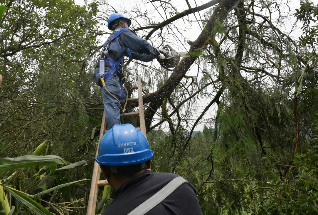在搶修現(xiàn)場(chǎng),在做好一系列安全措施以后,配電中心搶修人員用油鋸鋸斷搭在線(xiàn)路的樹(shù)木,再登上電桿,拆除原來(lái)的線(xiàn)路和刀閘,隨后更換故障刀閘,重新架設(shè)線(xiàn)路,恢復(fù)送電……搶修中,工作人員克服雨天路滑、天氣暴熱、搶修不易等困難,同時(shí)在當(dāng)?shù)卮迕竦亩αχС窒?,?jīng)過(guò)三個(gè)小時(shí)的艱苦鏖戰(zhàn),所有搶修工作圓滿(mǎn)落下帷幕。