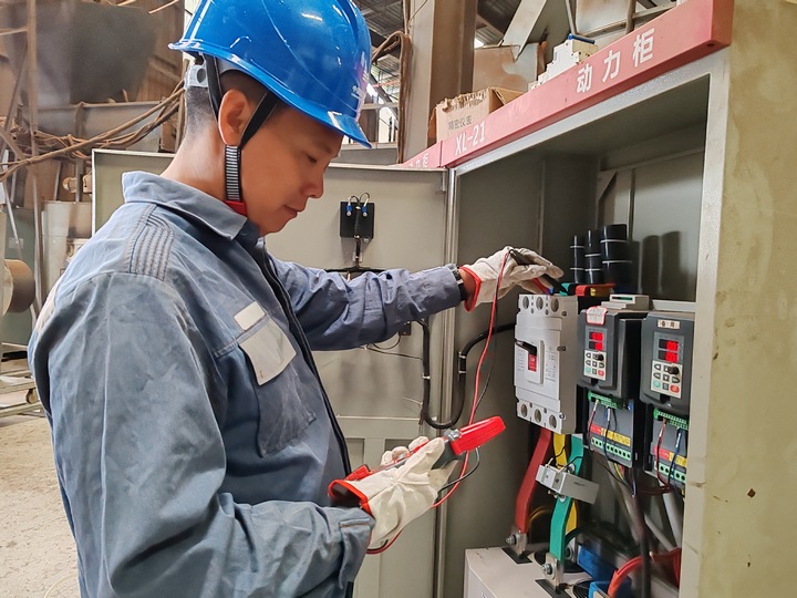 圖為南方電網(wǎng)興仁供電局工作人員對(duì)中義新能源燃燒顆粒廠配電設(shè)施進(jìn)行電壓負(fù)荷測(cè)量,制定“錯(cuò)峰用電優(yōu)化方案”。新能源燃燒顆粒在制作中對(duì)于持續(xù)粉碎、溫控烘干、聚米成粒的工業(yè)流程要求很高,長(zhǎng)時(shí)間高負(fù)荷運(yùn)轉(zhuǎn)的機(jī)械設(shè)備和用電高峰期的電壓穩(wěn)定性及電價(jià)成本成了該企業(yè)的一個(gè)生產(chǎn)痛點(diǎn)。
