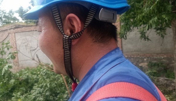 在現(xiàn)場,工作電鋸的呲呲聲、斧頭的敲打聲、腳扣攀登電桿的噠噠聲......每位工作人員全然顧不上天氣的悶熱,井然有序的全身心投入,“高空”開展伐樹、修剪作業(yè),不一會汗水就濕透了衣背。