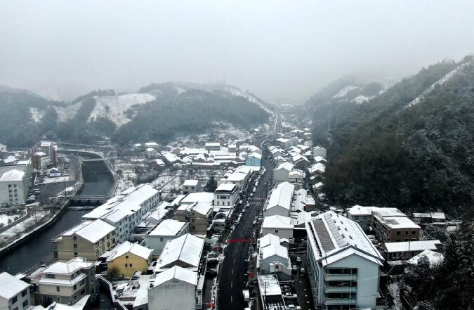 以四明山鎮(zhèn)為中心的天空里,雪花飛舞。環(huán)顧四周,大大小小的山頭已經(jīng)落滿了積雪,壓得竹林深深地彎下了腰,鄉(xiāng)間白墻黛瓦的屋檐上,已經(jīng)掛滿了長(zhǎng)長(zhǎng)的冰凌,推開窗戶哈一口白氣,就能感受到冬天的寒冷。