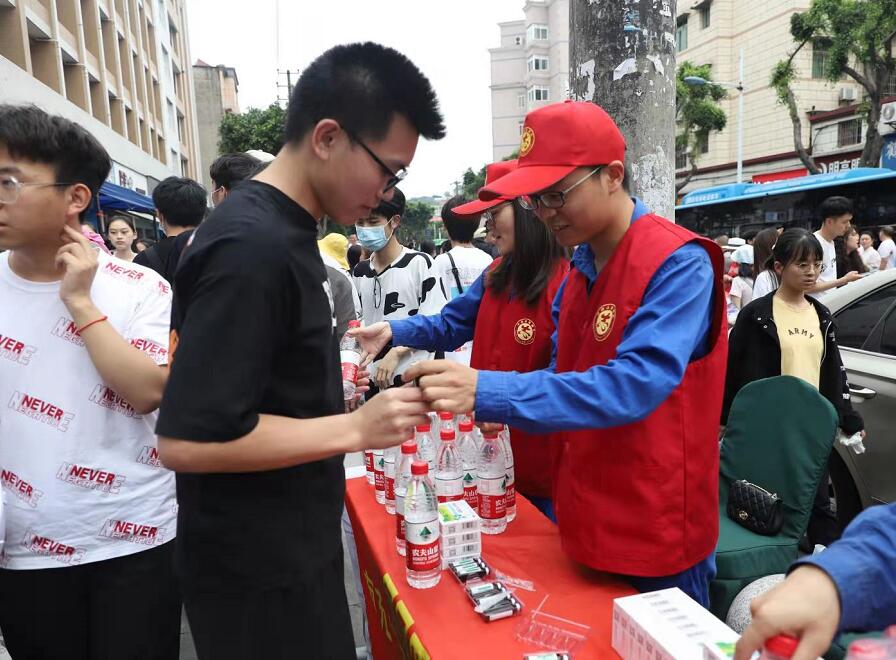 “保持平常心態(tài),加油,你們一定能考出好成績(jī)。”上午8時(shí)20分左右,隨著考生陸續(xù)進(jìn)場(chǎng),志愿服務(wù)點(diǎn)前熱鬧了起來,志愿者一邊為有需要的考生派發(fā)考試和防暑用品,一邊為他們加油鼓勁。