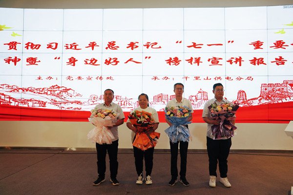 報(bào)告會(huì)上,四位宣講人用質(zhì)樸的語言、鮮活的事例,講述了一個(gè)個(gè)溫暖感人的真實(shí)故事——在平凡崗位上用堅(jiān)韌與執(zhí)著為電網(wǎng)安全撐起了一片晴朗的天空,對(duì)電力事業(yè)有著無限忠誠的越志軍;用一顆真誠心充當(dāng)“武器”,用淋漓的汗水支撐起使命,用堅(jiān)定的意志承擔(dān)起疫情防控工作的電力人吳飛云鵬;工作中兢兢業(yè)業(yè)、勤勤懇懇,生活中助人為樂、傳承美德,用實(shí)際行動(dòng)踐行著電力人的擔(dān)當(dāng)與奉獻(xiàn)的楊俊芝;九年征程一心堅(jiān)持,發(fā)揮基層黨組織的戰(zhàn)斗堡壘作用,為社區(qū)居民解決難事,為受難群眾提供幫助的康煒。他們的故事感人至深、催人奮進(jìn),生動(dòng)呈現(xiàn)了“身邊好人”的愛舉、壯舉、善舉、孝舉、義舉引起了現(xiàn)場(chǎng)強(qiáng)烈共鳴,感染著現(xiàn)場(chǎng)所有人。宣講結(jié)束后,志愿者們?yōu)榈綀?chǎng)的“身邊好人”獻(xiàn)花,大家紛紛表示要學(xué)習(xí)“身邊好人”,傳遞榜樣力量,奮斗新時(shí)代。